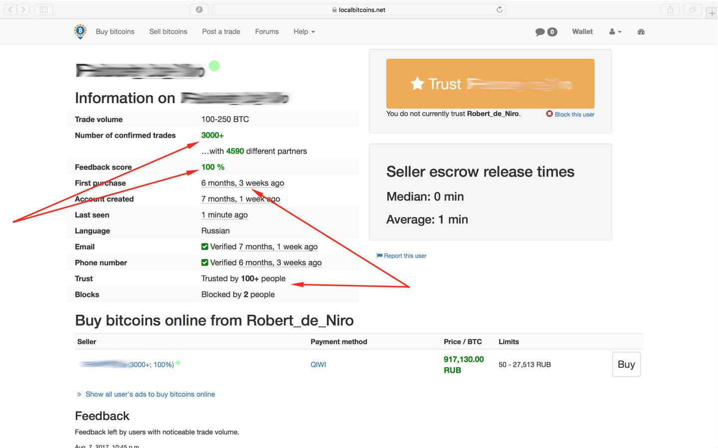 Там обратите внимание на то, как долго человек присутствует на localbitcoins.net, сколько успешных сделок он провел, объемы, число довольных и недовольных покупателей