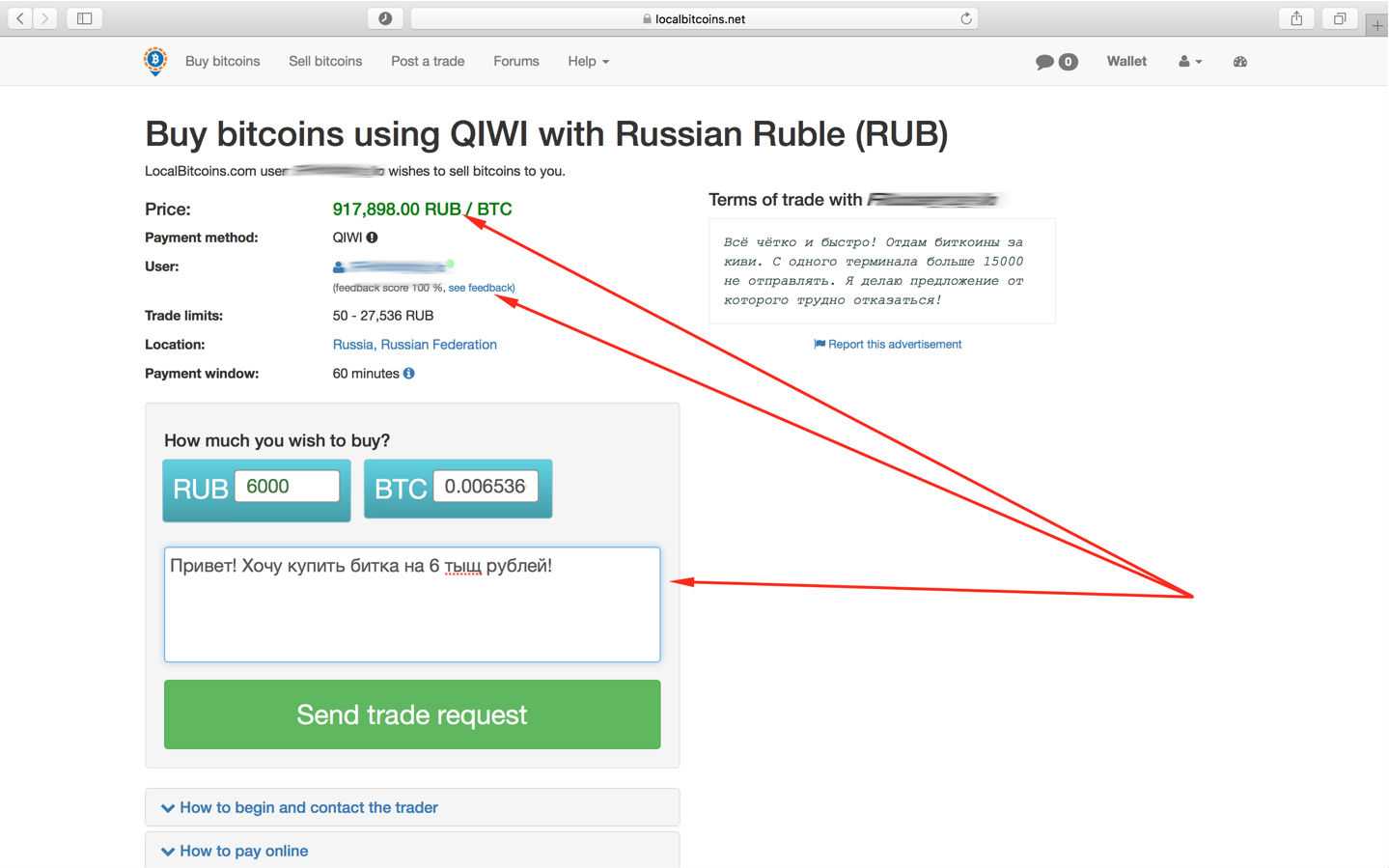 6) Удостоверившись, что продавец добропорядочный, а условия вам подходят, открываете сделку, указав суммы и написав в чат о том, что хотите купить Bitcoin. В ответ продавец вышлет вам реквизиты для перевода денег, в данном случае это будет номер QIWI-кошелька. После перевода денег, нажмите на кнопку о проведении оплаты – так площадка поймет, что вы исполнили свою часть сделки.