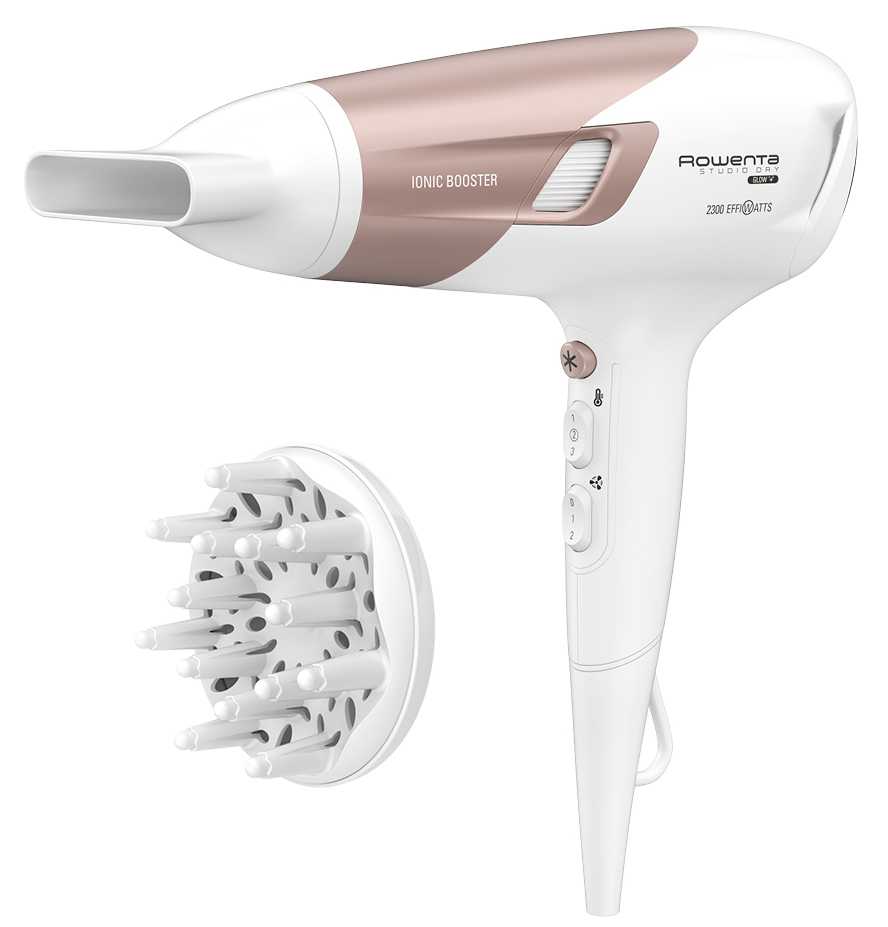 Данная модель фена позволяет провести профессиональную укладку в домашних условиях. Мощность ее составляет 2100 Вт, что обеспечивает быструю сушку стрижки, а также в ускоренном порядке придание ей объема и фиксации. Последняя процедура осуществляется при помощи функции обдува холодным воздухом. В процессе укладки применяется также ионизация, выработкой отрицательных ионов для которой занимается встроенный в корпус прибора генератор. При включении данной функции происходит закрытие чешуек на волосяном стержне, что обеспечивает гладкость и блеск прическе, снимает излишнюю электризацию. Работа Rowenta Studio Dry Glow CV5830F0 осуществляется в 6 вариантах настроек. Для увеличения срока службы изделия, производители укомплектовали его сетчатой решеткой, которая предотвращает попадание пыли и частичек волосинок внутрь прибора. Дополнительно в комплект входят 2 насадки. Диффузор позволяет рассеивать поток воздуха и высушивать корни, не затрагивая кончики, а концентратор, наоборот – собирает всю силу воздушного пучка в определенном месте. Длина шнура, составляющая 1,8 метра достаточна, чтобы не быть зависимой от близости розетки.