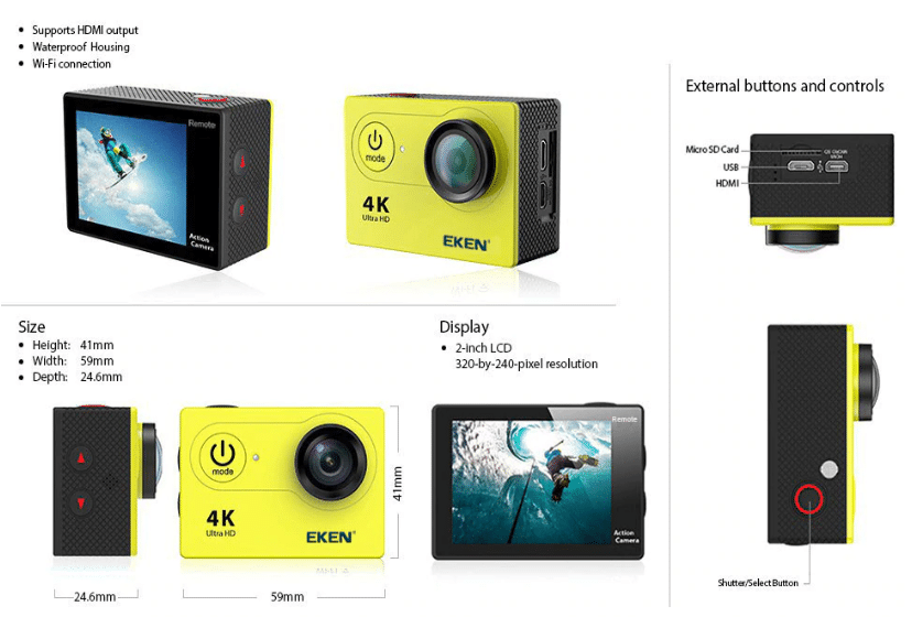 Недорогая камера снимает в режиме 4К, поддерживает цикличную запись, одиночные кадры и замедленную съемку. Оснащена автокорректировкой баланса белого, имеет встроенный модуль Wi-Fi. Может вести непрерывную съемку на протяжении 90 минут.