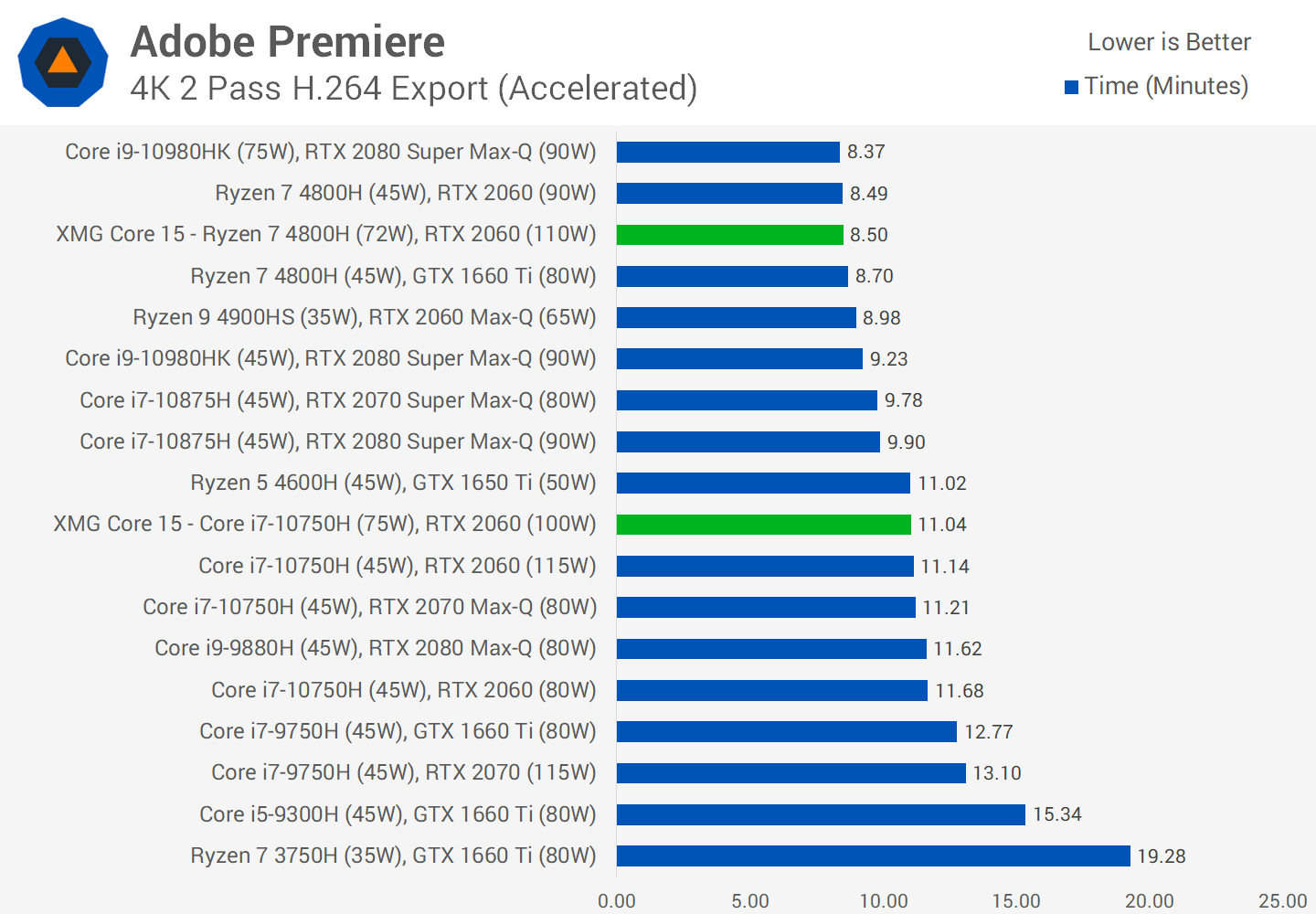 Для работы в Adobe Premiere очевидно лучшим вариантом является модель AMD. В Puget конфигурация AMD выполняет проигрывание клипов по прямой трансляции на 14% быстрее. Также примерно на 14% быстрее Intel она осуществляет экспорт видеофайлов (тоже в Puget) – это не такая большая разница, какую мы видели в CPU-кодировании, но быстрее – значит быстрее. Мы подозреваем, что низкие результаты ноутбука Intel здесь обусловлены тем, что, хотя задачи кодирования могут решаться силами видеокарты Nvidia, для решения периферических задач, например, декодирования видео, программа Premiere предпочитает обращаться к встроенной графике процессора Intel.