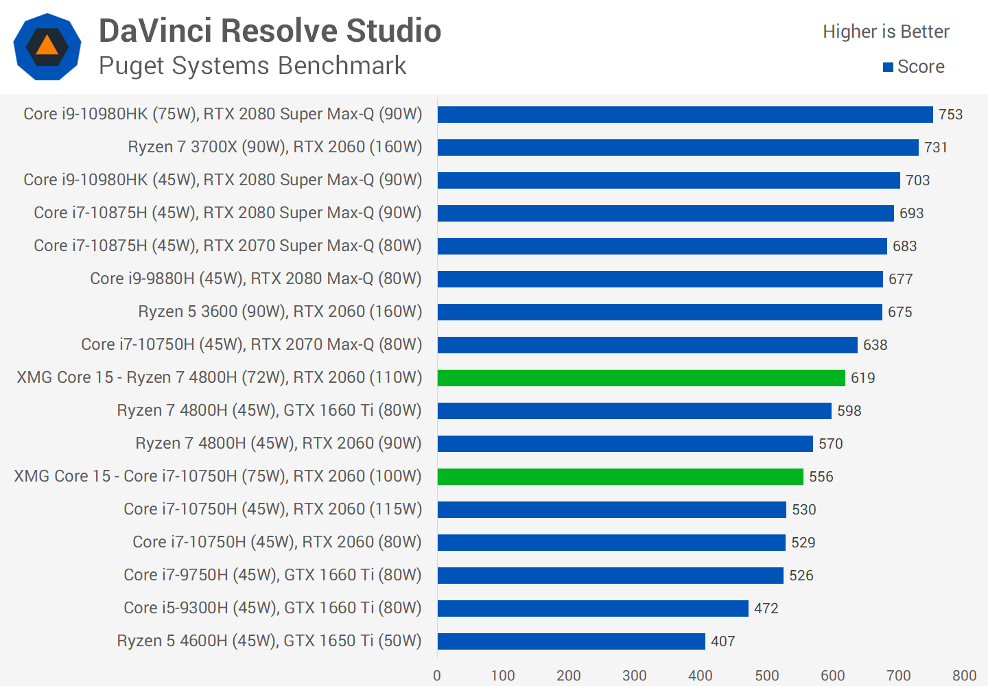 И, наконец, бенчмарк DaVinci Resolve, где система AMD еще раз проявляет себя как более предпочтительный вариант. Огромной разницы в результатах в этом тесте не наблюдается, но модель AMD здесь в целом на 11% быстрее, что можно отнести на счет более эффективной схемы CPU и немного большего ресурса мощности для GPU.