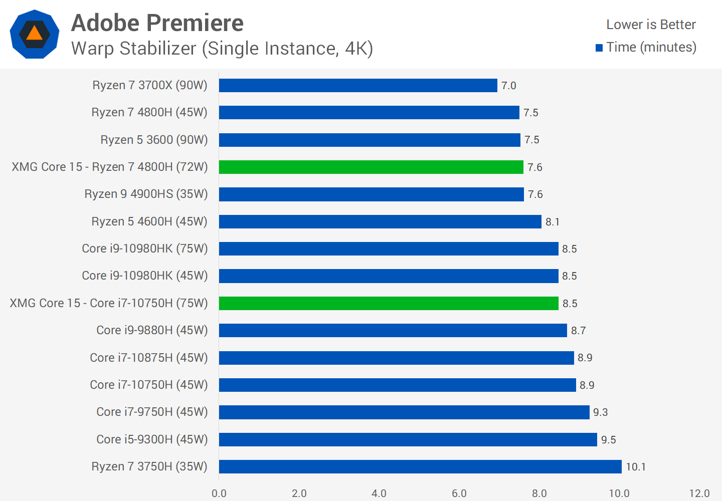 Adobe Photoshop отдает чистую победу машине Intel. Одну из редких побед в сегодняшнем тестировании, хотя с учетом того, что Photoshop не является в полной мере многопоточной нагрузкой, в преимуществе системы с более высокой однопоточной производительностью нет ничего удивительного. Система AMD здесь медленнее всего на 3%, и для тех, кто собирается покупать машину для смешанной нагрузки, эта разница, скорее всего, не станет достаточным основанием для однозначного выбора в пользу ноутбука Intel, но конкретно пользователи Photoshop могут иметь в виду, что в бенчмарке Puget система Intel быстрее.