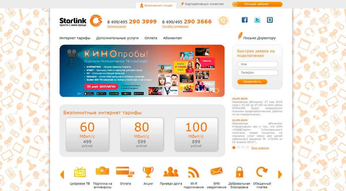 Если ищете услуги по подключения домашнего интернета в Москве, вы можете найти дешевый тариф от 500 рублей в месяц. Старлинк предлагает оплату интернета без комиссии с помощью банковских карт, счета на мобильном телефоне, кошельком QIWI или Сбербанком Онлайн.