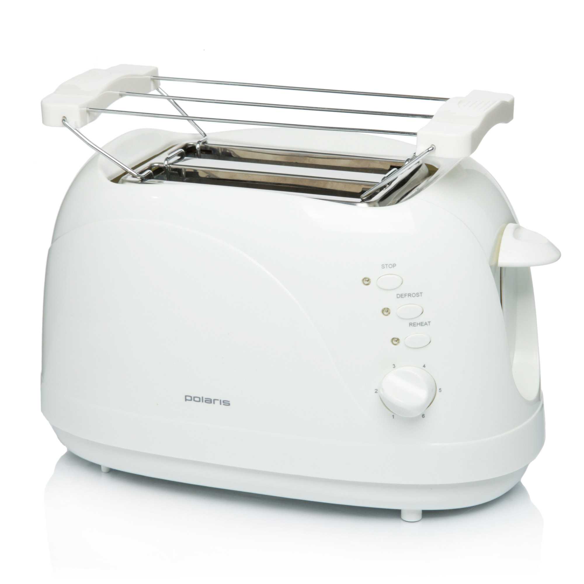 Компактное устройство из термостойкого пластика, белый цвет отлично впишется в любой интерьер кухни. Прибор гарантирует поджарку двух тостов. Дополнительно производитель позаботился о возможности подогреть булочку, круассан с помощью решётки. За такую функциональность потребуется заплатить немного.
