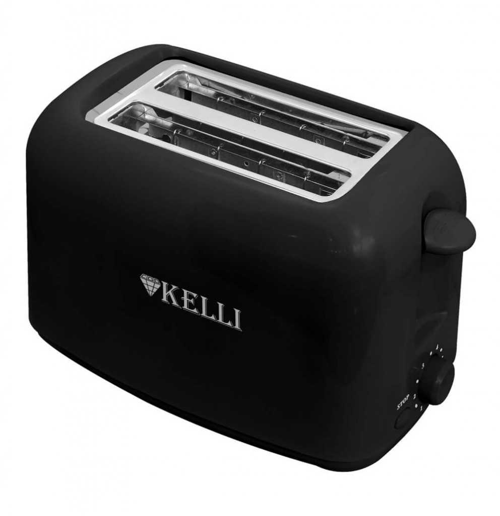 Тостер Kelli поджаривает с двух сторон одновременно два куска хлеба. Степень прожарки регулируется и имеет 6 вариаций. Есть кнопка на панели, которая позволяет в любой момент остановить процесс. Высокая степень изоляции не позволяет приборы нагреваться при продолжительной работе. Режим работы – полуавтоматический. Мощность – 800 Вт.