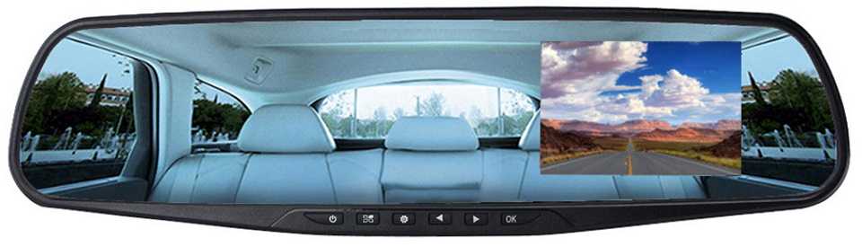 Отличный видеорегистратор, выполненный в виде зеркала заднего вида. В комплекте присутствуют две камеры, одна предназначена для передней съемки, а другая — для тыльной. Максимальное разрешение – 1080p, что позволит разглядеть мелкие детали и номер автомобиля без особых проблем. Режим записи циклический. Присутствует G-сенсор, который автоматически включается после повреждения кузова.