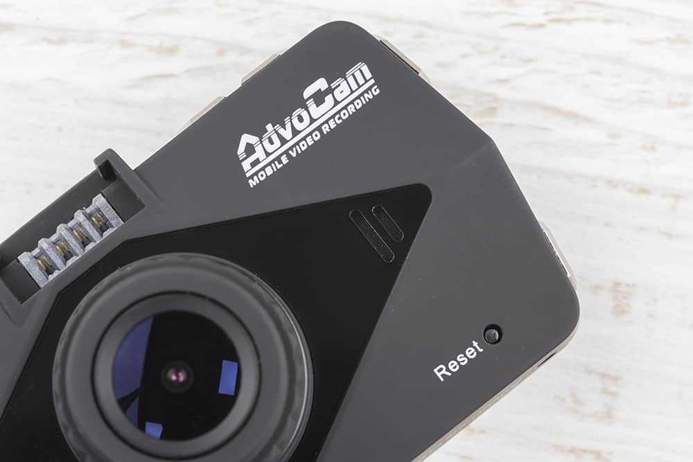 Заднюю грань видеорегистратора занимает объектив, обрамленный вставкой из глянцевого пластика. Правее от него видна решетка динамика, ниже – кнопка сброса.
