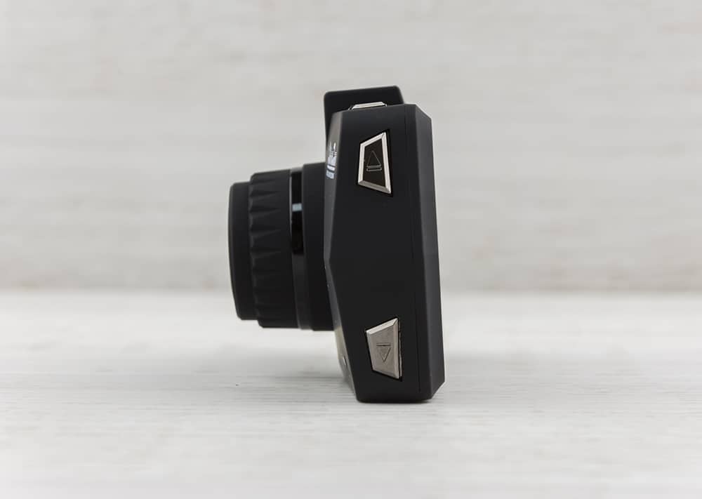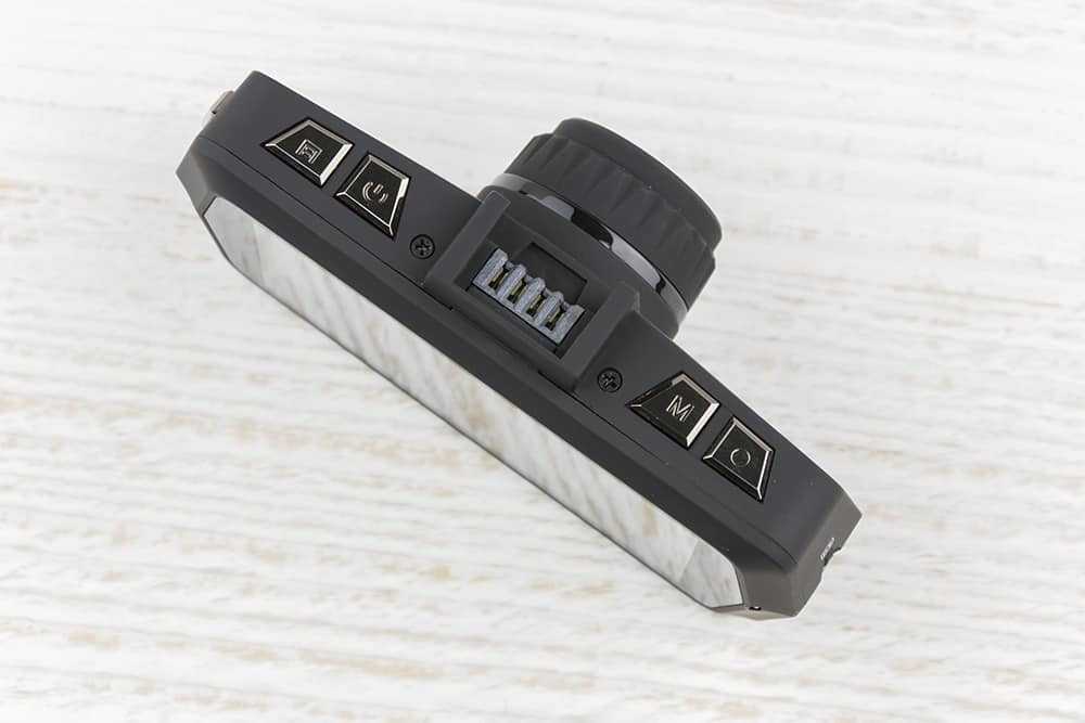Посередине верхнего торца видеорегистратора находится специальное крепление для кронштейна. Он вставляется в соединительные пазы, а затем крепится к лобовому стеклу присоской. Левее от крепления можно увидеть две клавиши, отвечающие за смену режимов и ручной запуск/остановку видеосъемки. Кнопки справа включают и выключают камеру, а также вызывают меню устройства.