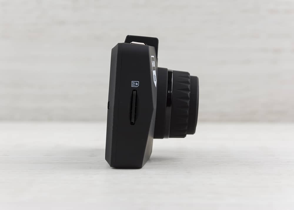 Поддерживаются карты памяти microSD объемом до 32 Гб. Корпус регистратора выполнен из черного пластика. Объектив заметно выступает вперед, а с правой стороны от него можно увидеть светодиод. Несмотря на выступающий объектив, устройство выглядит довольно тонким и не занимает много места в салоне.