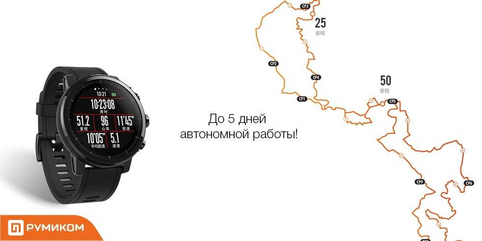 Часы не требуют постоянного ношения зарядного устройства или кабеля, так как при повседневном использовании они могут проработать 5 дней на одном заряде. При включении спортивного режима с отслеживанием по GPS время использования составляет до 35 часов — этого хватит на многокилометровый забег по пересеченной местности.