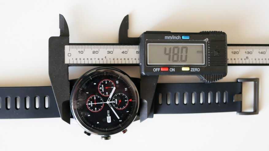 Вес Xiaomi (Huami) Amazfit Stratos составляет почти 59 грамм, они ощущаются на руке довольно увесисто (особенно после легких фитнес-браслетов), однако к весу быстро привыкаешь и перестаешь обращать на это внимание. Диаметр часов 48мм
