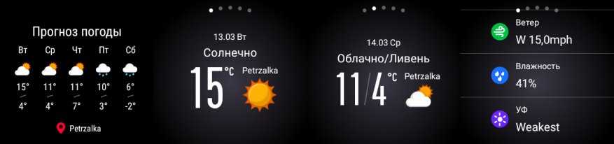Важно: Про такие функции, как шагомер и измеритель давления, говорить смысла нет – и так понятно, что они есть, причем пульсометр работает довольно точно, при тесте с медицинским измерителем пульса расхождение составляло 1-2 удара, что говорит о высокой точности датчика. Также на часах можно посмотреть погоду, а также настроить нужное количество будильников