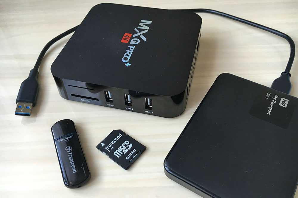 Андроид смарт приставки, как правило имеют не очень большой объем внутренней памяти, максимум 32Гбайт. При таком объеме не желательно хранить большие файлы во внутренней памяти. Для хранения больших файлов лучше использовать внешний жесткий диск с USB-адаптером для подключения или MMC флешку. Cмарт ТВ приставки MXQ Pro поддерживают поддключение внешних жестких дисков и SD/MMC флешек емкостью до 32Гбайт. Для подклчения внешних носителей не требуется установка дополнительных программ, как правило файлы с устройств можно прочитать сразу после подключения.