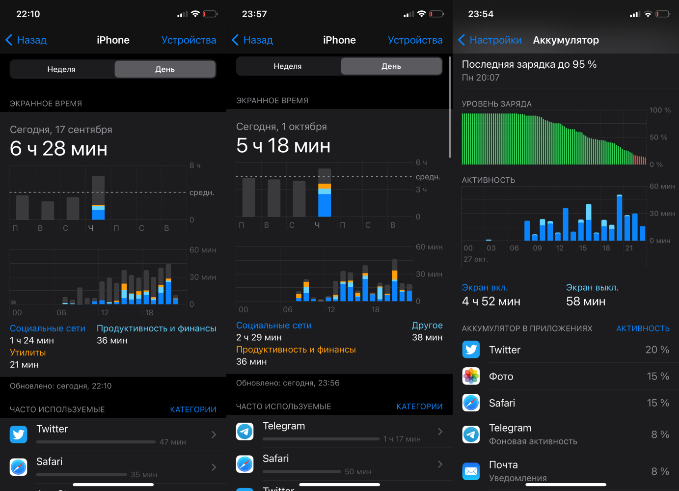 Почему у меня не выходит 8-10 часов активного экрана на iPhone 11 Pro, как у остальных, — не знаю. Причём у iPhone 11 Pro моей жены такие же показатели времени работы, как ни странно. Проклятье может быть какое-то. Но такое ощущение, что все довольны батарейкой телефона, кроме меня.