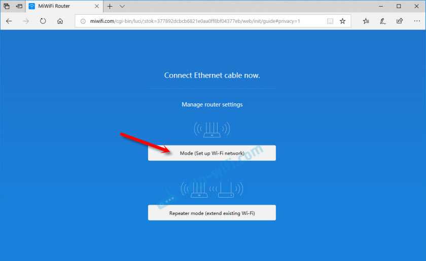 Дальше может появится (а может и не появится) окно, в котором нужно выбрать режим работы. Их там два: роутер и репитер. Нам нужен первый режим «Mode (Set up WiFi Network)». Если вы хотите настроить свой Mi Wi-Fi Router 3 в режиме репитера, то смотрите статью: роутер Xiaomi как репитер.