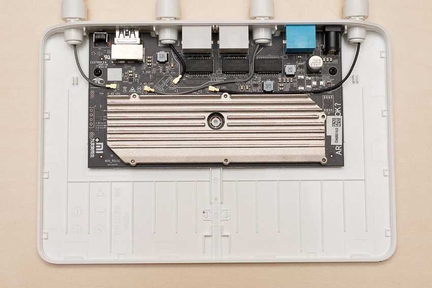 Под радиатором располагаются процессор, ОЗУ, радиоподсистема Wi-Fi (исключая выходные каскады для усиления сигнала в антенну) и флеш-память. Микросхемы Ethernet в дополнительном охлаждении не нуждаются. Есть возможность установить внутрь пару миниатюрных вентиляторов от нерабочего ПК или ноутбука.