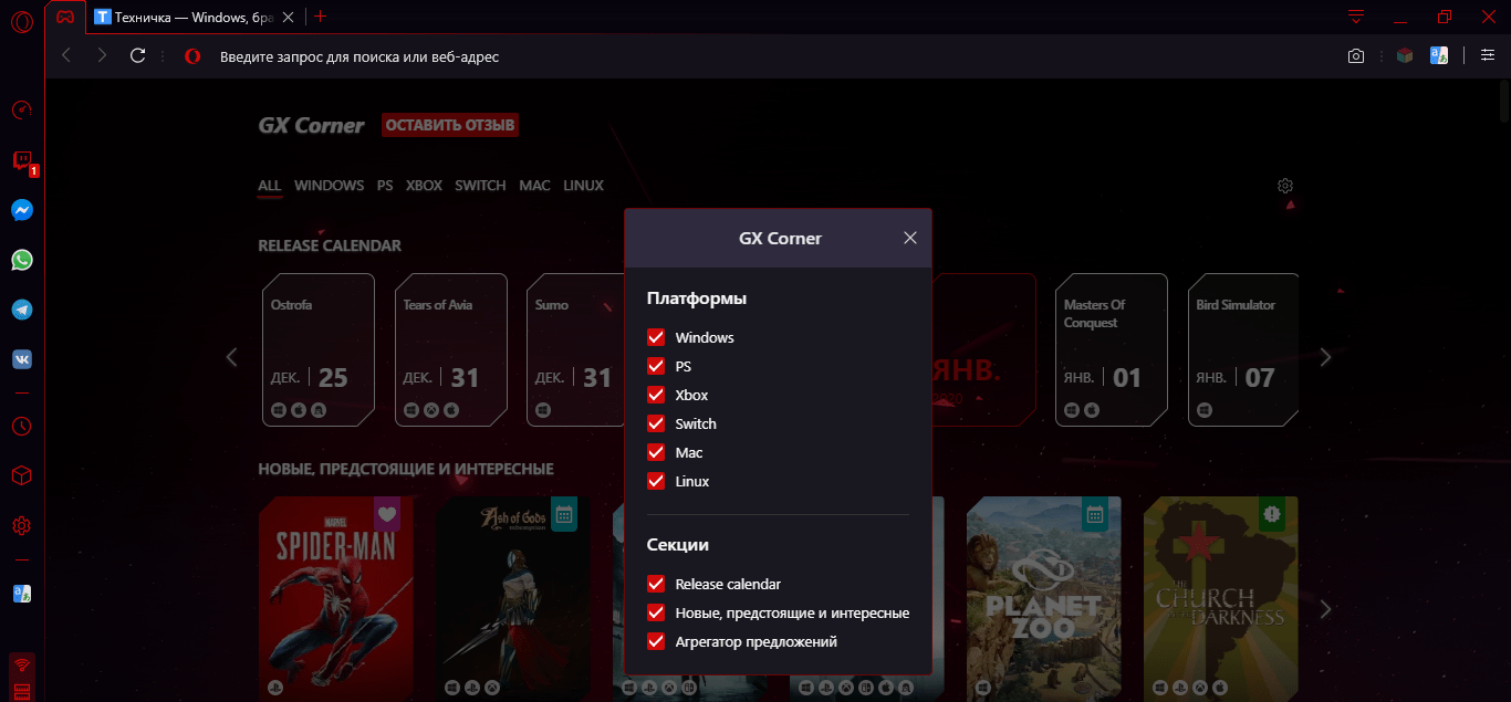 Разумеется нельзя назвать браузер игровым лишь из-за иной темы оформления и наличия звуков. Нужны фишки! Особенности! Такие как GX Corner, например. Что это? Это агрегатор новостей, которые так или иначе связаны с игровой тематикой, расположенный на выделенной для него вкладке.