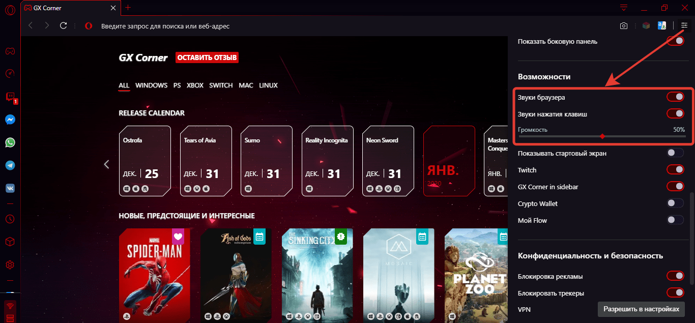 Управляем звуковыми эффектами в Opera GX