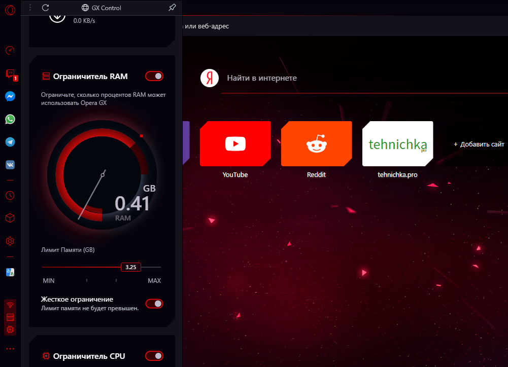 RAM Limiter — ограничьте, сколько процентов RAM может использовать Opera GX. Потребление оперативной памяти браузерами никогда не устраивало пользователей. Вспомните только Google Chrome, который является отличнейшим браузером, но способен сожрать бесконечное количество ОЗУ.