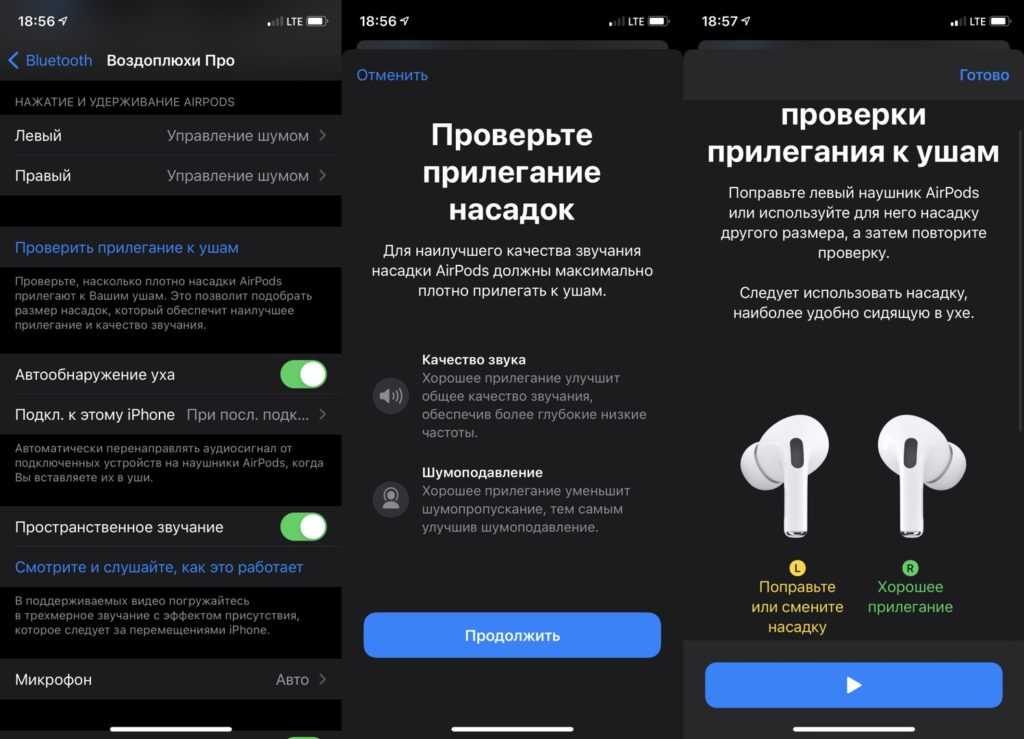 Еще одна классная фишка AirPods Pro — система проверки прилегания насадок. В настройках наушников на iPhone (в меню Bluetooth) можно запустить специальный тест, который определит, правильно ли надеты наушники.