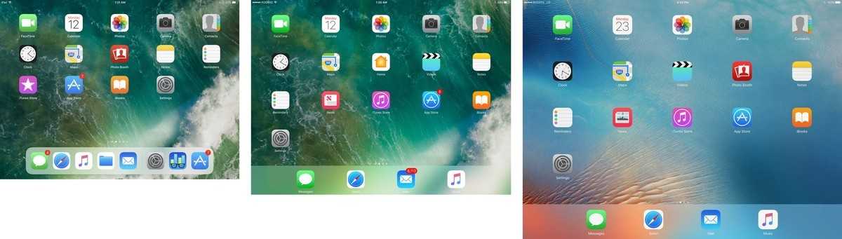 При разрешении экрана 2224 x 1668, 10,5-дюймовый iPad имеет на 20% больше пикселей, чем 2048 x 1536 в 9,7-дюймовой модели. Это все еще далеко от 2732 x 2048 в 12,9-дюймовой модели. Вот как они выглядят бок о бок, 9,7 дюймов (слева), 10,5 дюймов (середина) и 12,9 дюймов (справа):