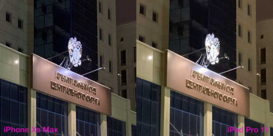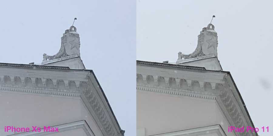 Как показывают кропы, камера iPad Pro 11 всё-таки отстаёт от топового смартфона Apple. Я бы поставил её на уровень iPhone 7. К тому же Xs Max более аккуратен с детализацией. Да и в сложных местах кадров, где есть тени, он передаёт информации всё-таки больше — виден рельеф стен, неровности и прочие нюансы. На фото с iPad всё это размыто.