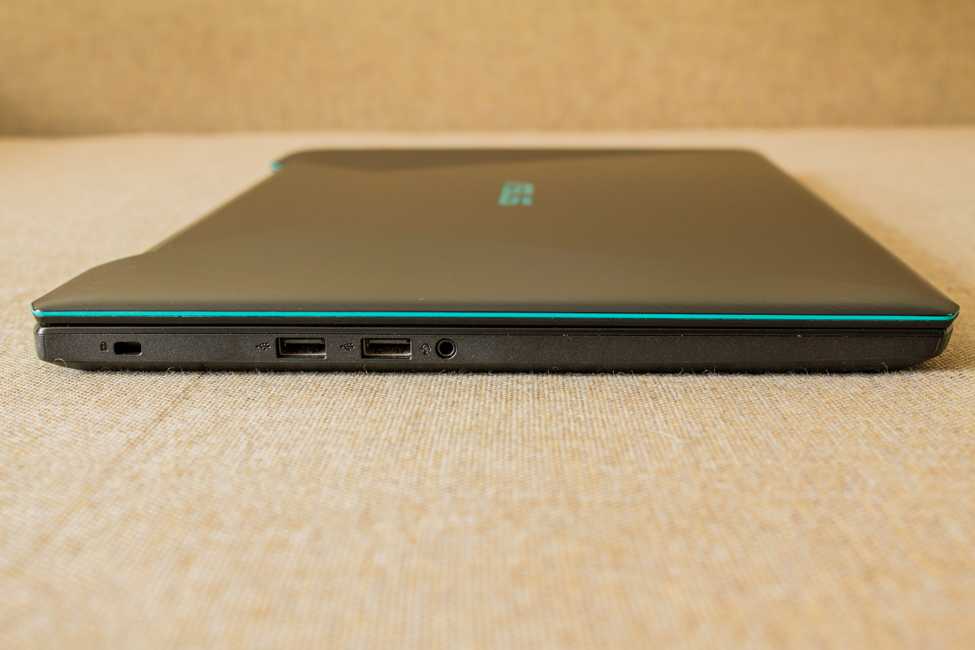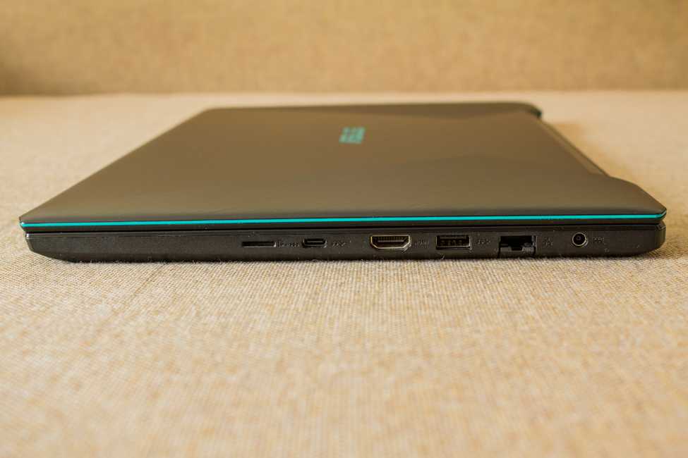В дизайне ноутбука таки прослеживаются легкие намеки на игровую принадлежность, но никаких по-настоящему агрессивных и эксцентричных дизайнерских изысков с чёрно-красными цветовыми оттенками, которые мы за многие годы привыкли наблюдать в игровых ноутбуках, здесь нет. Последние были заменены на ярко-голубые (или бирюзовые), да и то, их не очень много — этим цветом окрашены окантовка вокруг крышки ноутбука и площадки тачпада, а также логотипы производителя на крышке и под экраном.