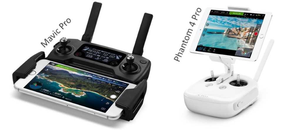 Оба пульта управления требуют наличия смарт устройства (телефона, планшета), для того, чтобы задействовать все функции квадрокоптеров. Смартфон подключается по кабелю к пульту управления, на него устанавливается приложение DJI Go и все, можно управлять дронами. Дальность действия у них различается, 4 против 7 км. Phantom 4 Pro имеет еще один плюс — частота работы контроллера может быть как 2,4 Ггц, так и 5,8 Ггц. Выбирает он ее автоматически, в зависимости от текущей загруженности сети, т.к. на 2,4 Ггц в городе работает куча бытовых беспроводных устройств и в месте запуска квадрокоптера сеть может быть перегружена.