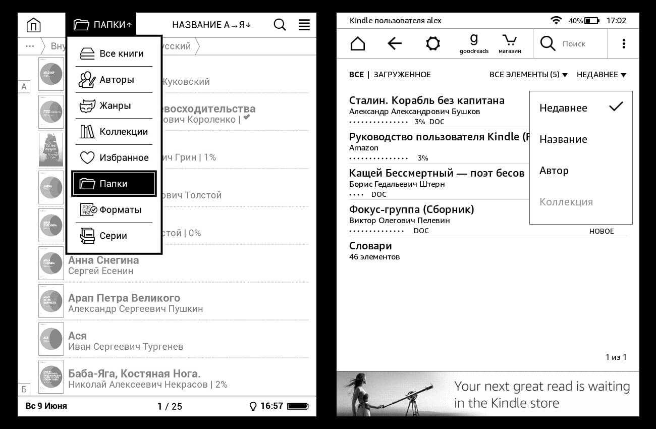 Настроек как для текста, так и для сортировки книг ощутимо больше в PocketBook. Вообще ридеры этой компании – они для перфекционистов. Можно настроить все и вся. У Kindle с настройками все заметно скромнее. На скриншотах ниже, например, варианты сортировки библиотеки. В PocketBook их гораздо больше. Или, скажем, размер шрифта взять. Kindle предлагает 14 вариантов, а PocketBook – 30. Ну и так далее.