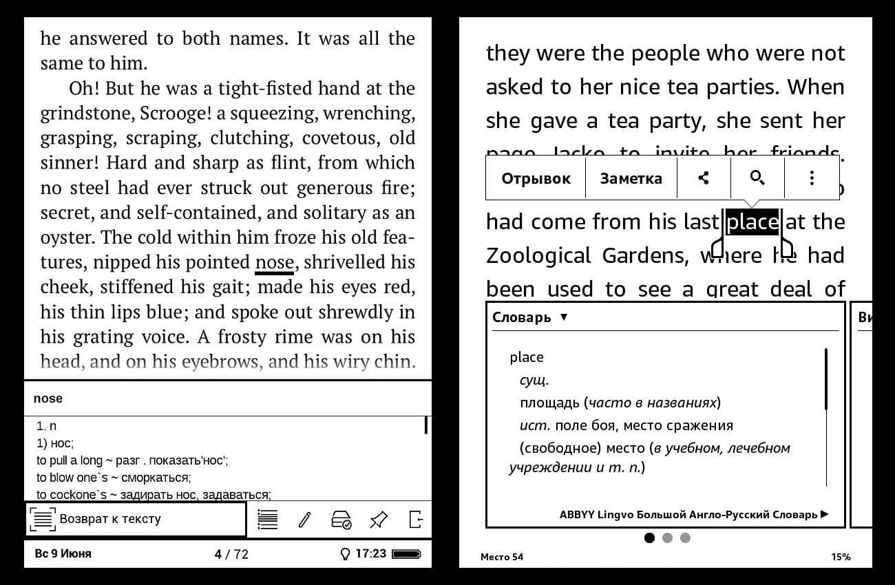 У обоих ридеров 6-дюймовые дисплеи на базе технологии «электронные чернила», ну или E Ink. И там, и там применяются экраны последнего поколения – E Ink Carta. Для порядка напомним, что от предыдущей версии E Ink под названием Pearl экраны Carta отличаются повышенной контрастностью – 15:1 против 12:1. На практике это означает прирост четкости букв, особенно при выставлении мелкого шрифта.
