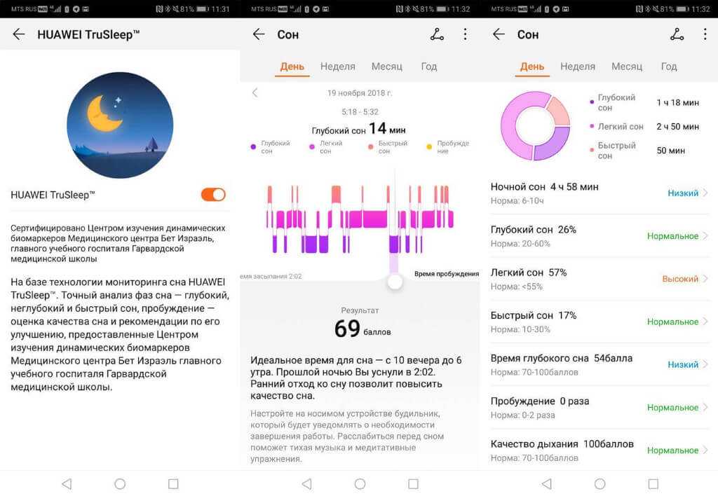 Huawei заявляет о том, что инструменты для мониторинга и контроля сна разрабатывались совместно с Гарвардской медицинской школой. Браслет не только выявляет фазы сна, но и распознает 6 распространенных проблем со сном и дает более 200 рекомендаций по его улучшению.