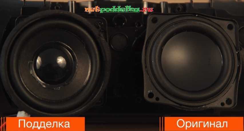 Различия есть и в динамиках. У подделки они бумажные. Оригинал имеет полипропиленовые динамики, которые не боятся воздействия воды.
