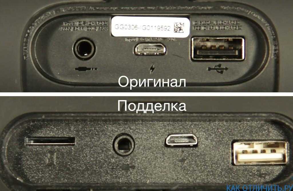 Если вам удастся добраться до места с разъемами в колонке, то помните: в оригинальной колонке только три отверстия: USB, микро-USB и джек-кабель. В подделке отверстий четыре – в ней предполагается еще и проигрывание микроSD- карты.