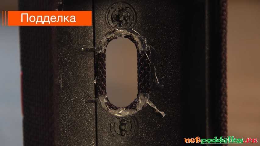 При разборке подделки JBL Charge 3 можно заметить обильное количество клея, который нанесен кустарным способом. У оригинала все прикреплено аккуратно. Клей присутствует, но он нанесен на спецоборудовании.