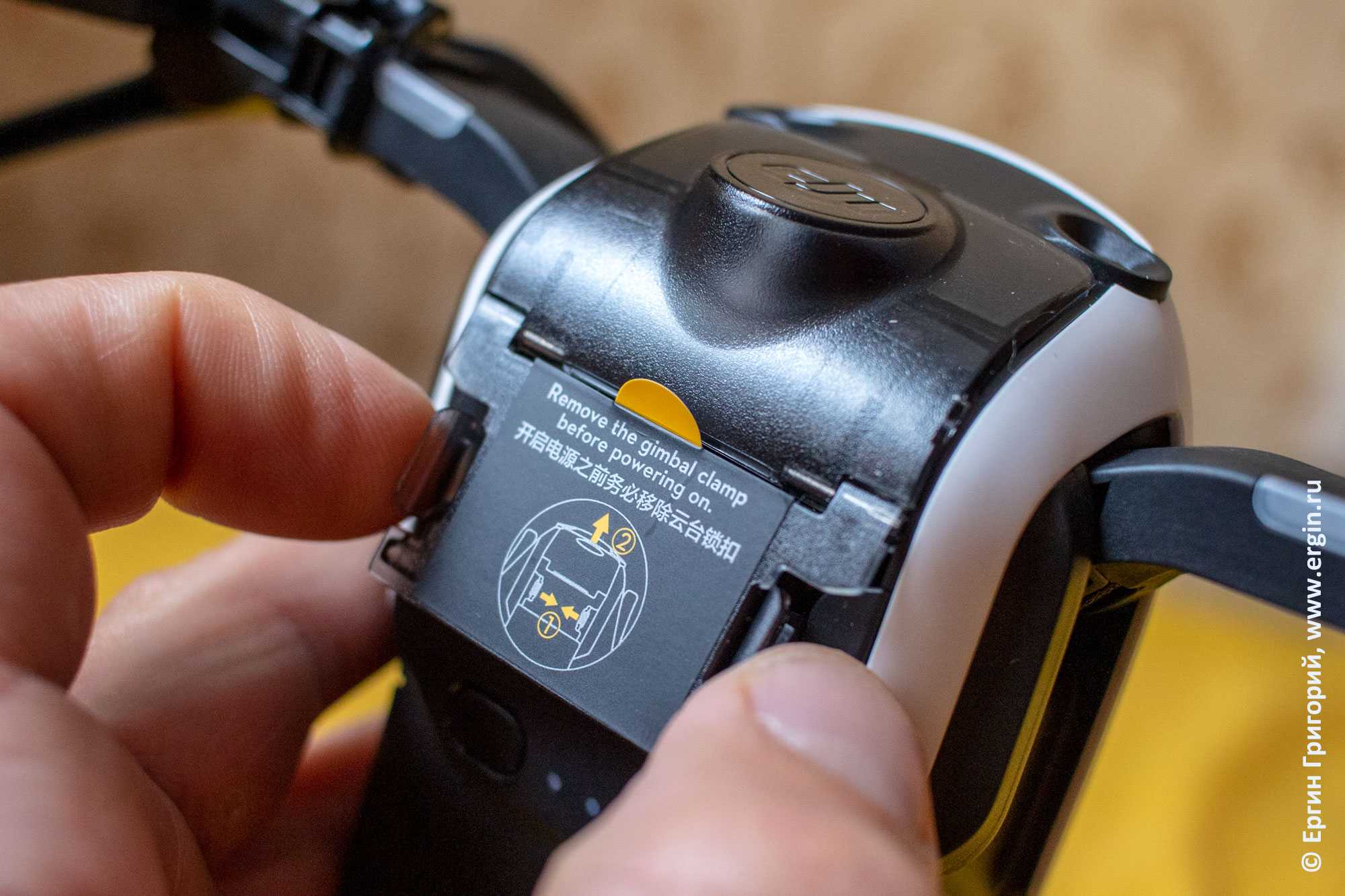 Перед включением снимите фиксатор камеры. Говорят, что можно повредить подвес, если не снять вовремя фиксатор. Я несколько раз забывал — все пока цело. Программа сообщает, если фиксатор не снят. Главное, не потеряйте фиксатор после снятия:) — специального места для хранения не предусмотрено. И не наступите на него.
