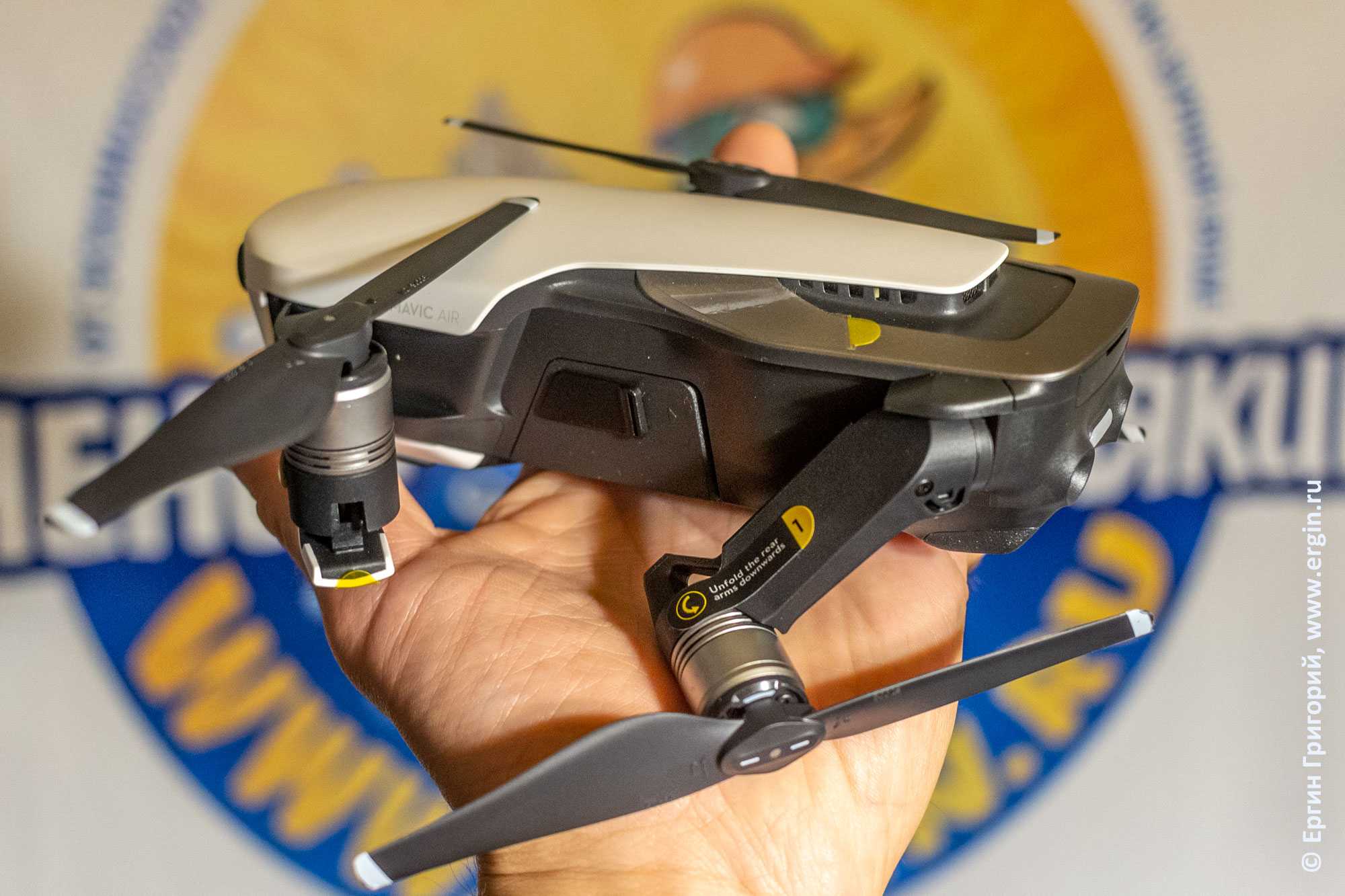 Для экстренного отключения DJI Mavic Air и посадки на руку необходимо аккуратно подвести руку снизу к передней половине квадрокоптера (взять его «под челюсть») — тогда датчики, находящиеся ближе к хвосту, не отреагируют. Остерегайтесь винтов! Нажмите левый джойстик вниз до упора и удерживайте: винты остановятся. Или, захватив корпус рукой, резко поверните квадрик на 180 градусов винтами вниз — винты отключатся сразу.