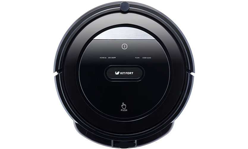 Робот Kitfort имеет классическую круглую форму, изготовлен из пластика черного цвета, на лицевой стороне которого имеется панель управления с сенсорными клавишами и электронный дисплей.