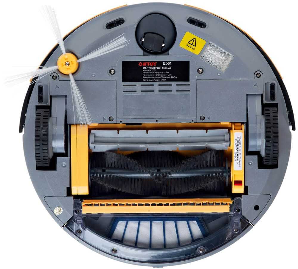 Основная и одна боковая щетки расположены на днище. Вместе с ультрафиолетовой лампой и датчиками, отслеживающими перепад высот и не позволяющими гаджету падать с высоты.