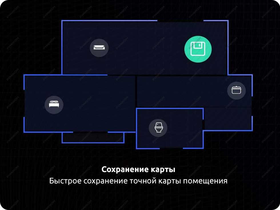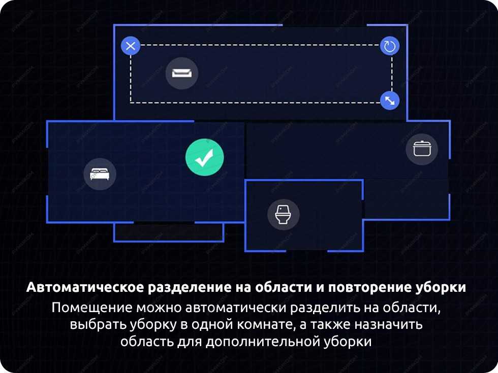 После первой уборки робот делит построенную карту помещения на отдельные комнаты. Технология открывает доступ к таким опциям, как: выставление виртуальных границ, задавать самостоятельно зону для локальной уборки (нарисовав прямоугольник на карте в приложении).