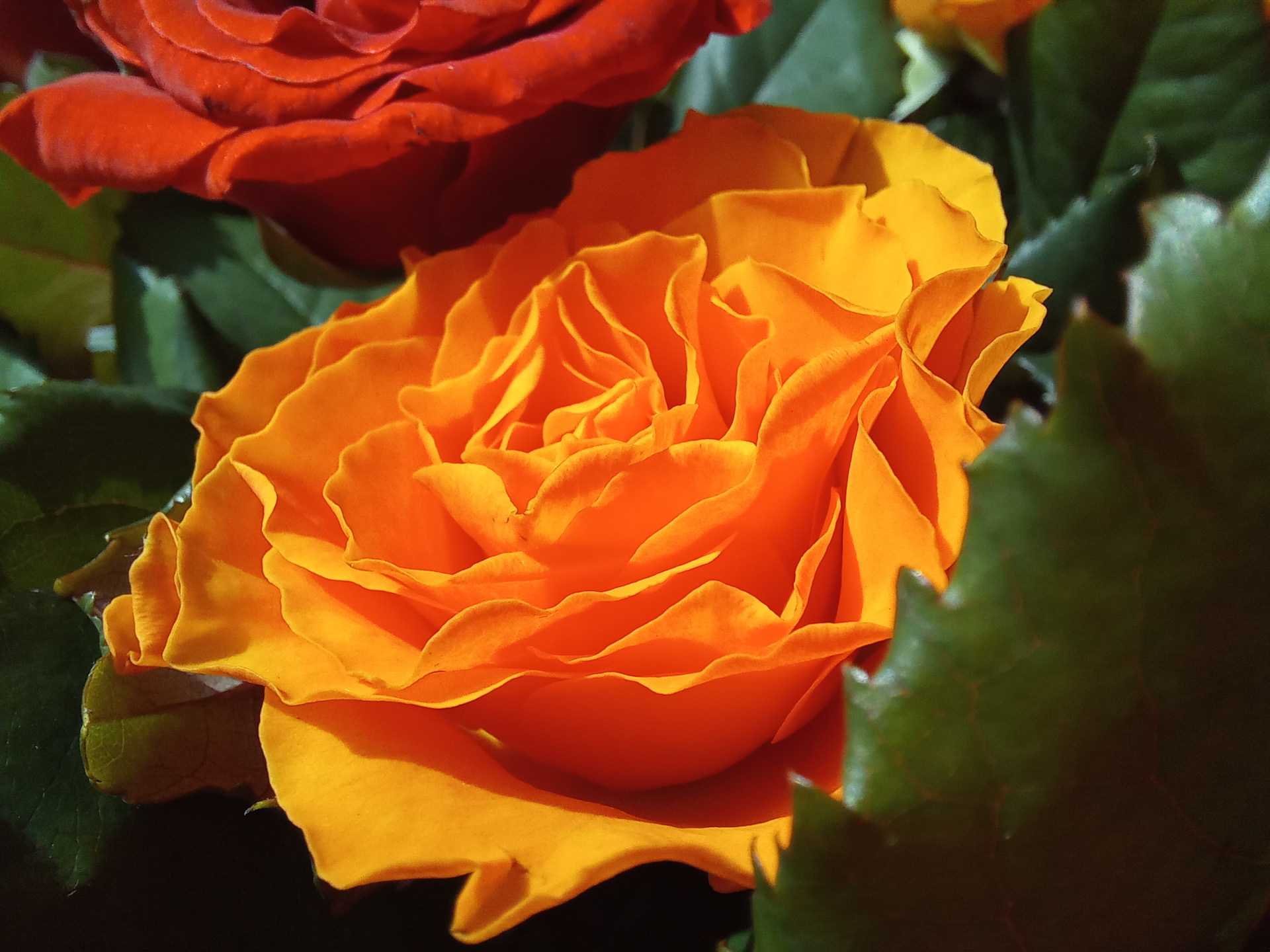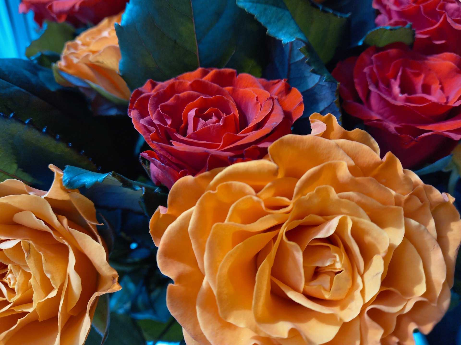 Цветочное фото в помещении на основную камеру. Телефон промахнулся с балансом белого, оранжевый стал каким-то желтоватым, а зелёные цвета отдают синевой