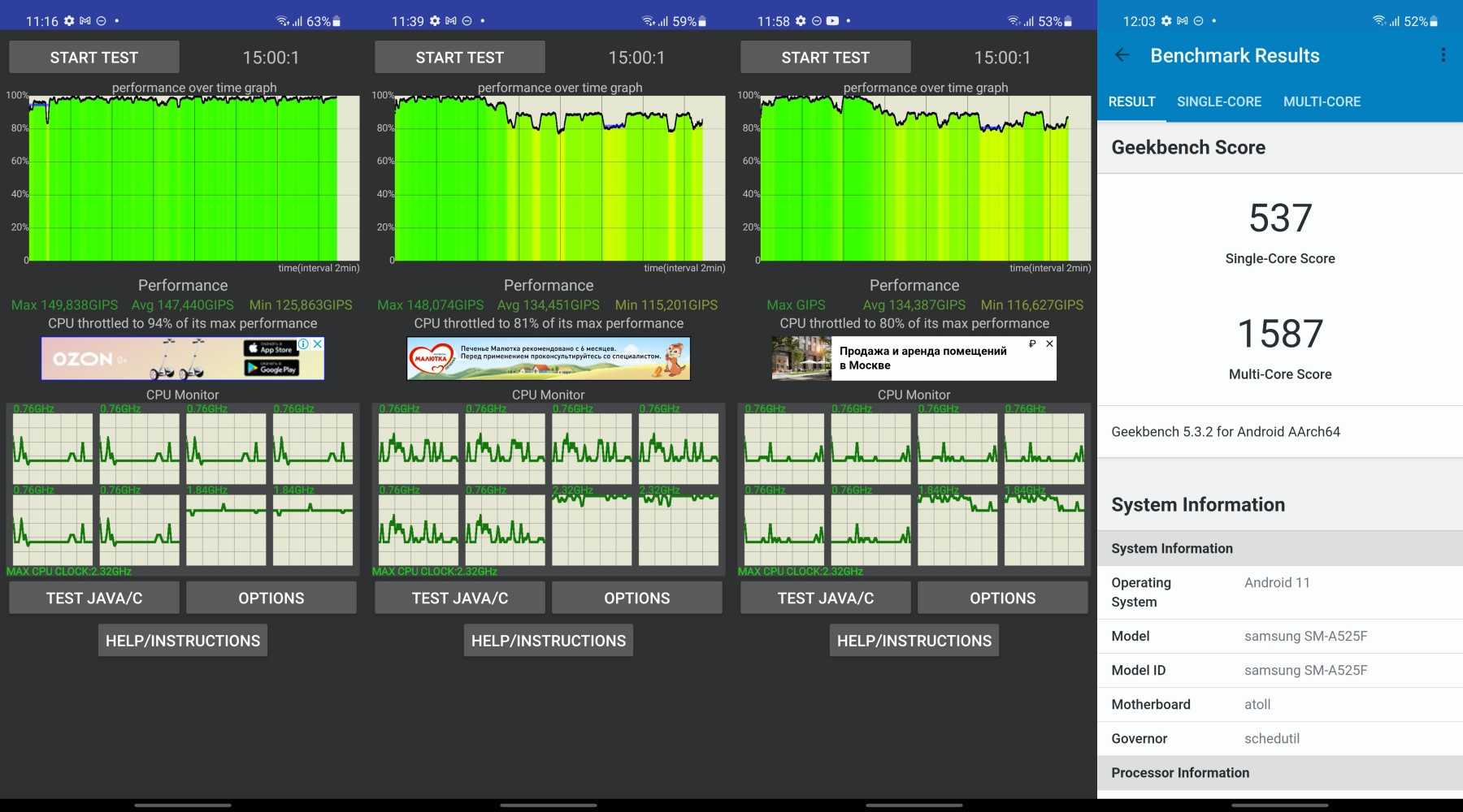 Тест на троттлинг телефон проходит поначалу без особых потерь, но после серии тяжёлых испытаний результаты падают процентов на 20. Если планируете играть на максимальных настройках графики в COD Mobile, то можете столкнуться с падением частоты кадров, но если вернуться к средним параметрам, то ощущения будут приятными.