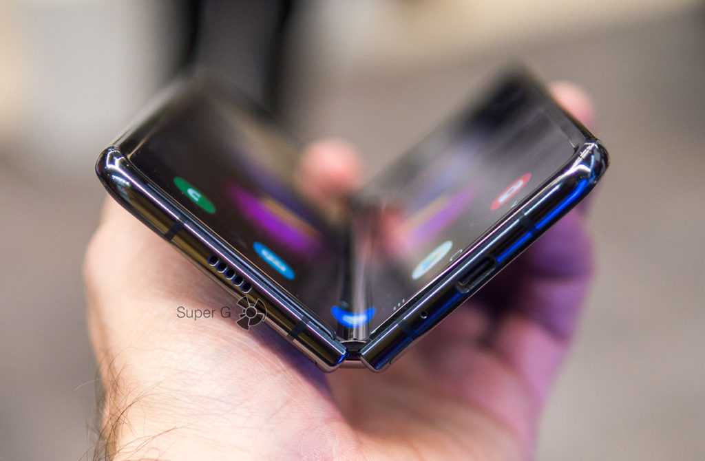 Главный вопрос, который волнует всех — виден ли сгиб? И если да, то насколько это критично при эксплуатации? Сгиб виден, особенно при выключенном экране. Также это заметно, когда развернутый экран поворачивается и свет пробегает по поверхности. Бросается это в глаза, если смотреть на экран со стороны, под довольно большим углом. Но при работе со смартфоном, скажем так, лицом к лицу, на это практически не обращаешь внимания — ни при чтении, ни во время серфинга. Это касается просмотра видео и игр.