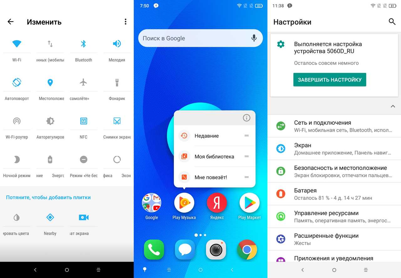 Смартфон Alcatel 5V работает под управлением операционной системы Android 8.1.0 (Oreo), интерфейс которой закрывает фирменная оболочка Joy1, выполненная, к счастью, без особых художественных излишеств. Свайп от верхнего края экрана открывает панель уведомлений и быстрых настроек, а также ползунок регулировки яркости. Тап с удержанием на иконке приложения приводит к появлению меню доступа к часто используемым функциям.