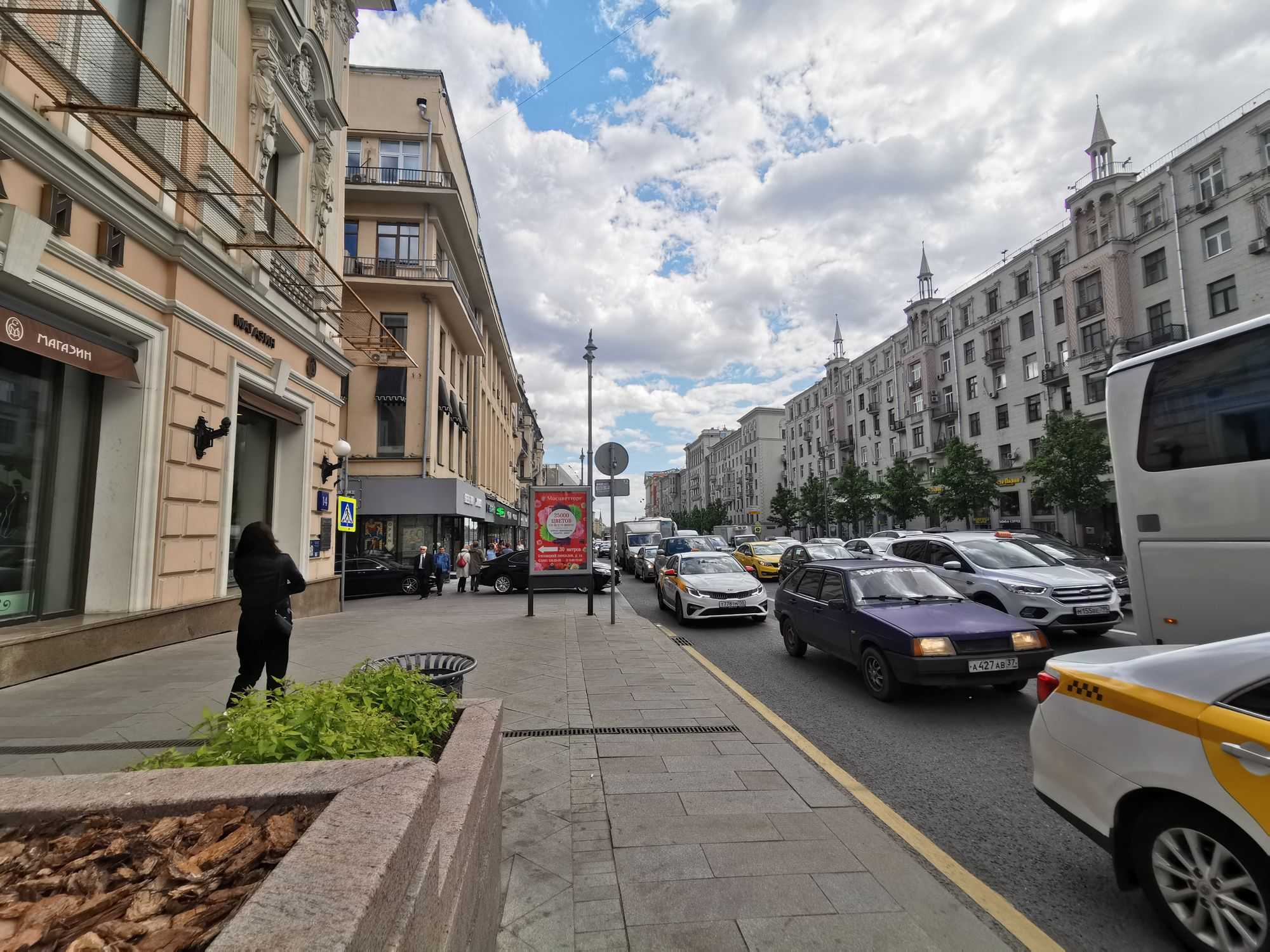 Следующие две фотографии были сделаны на Тверской. Удалось увидеть башню Кремля, расположенную в самом конце.