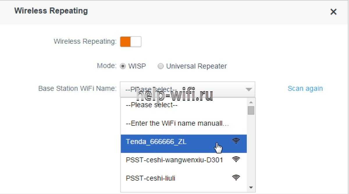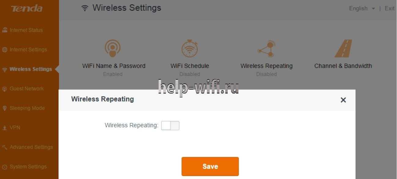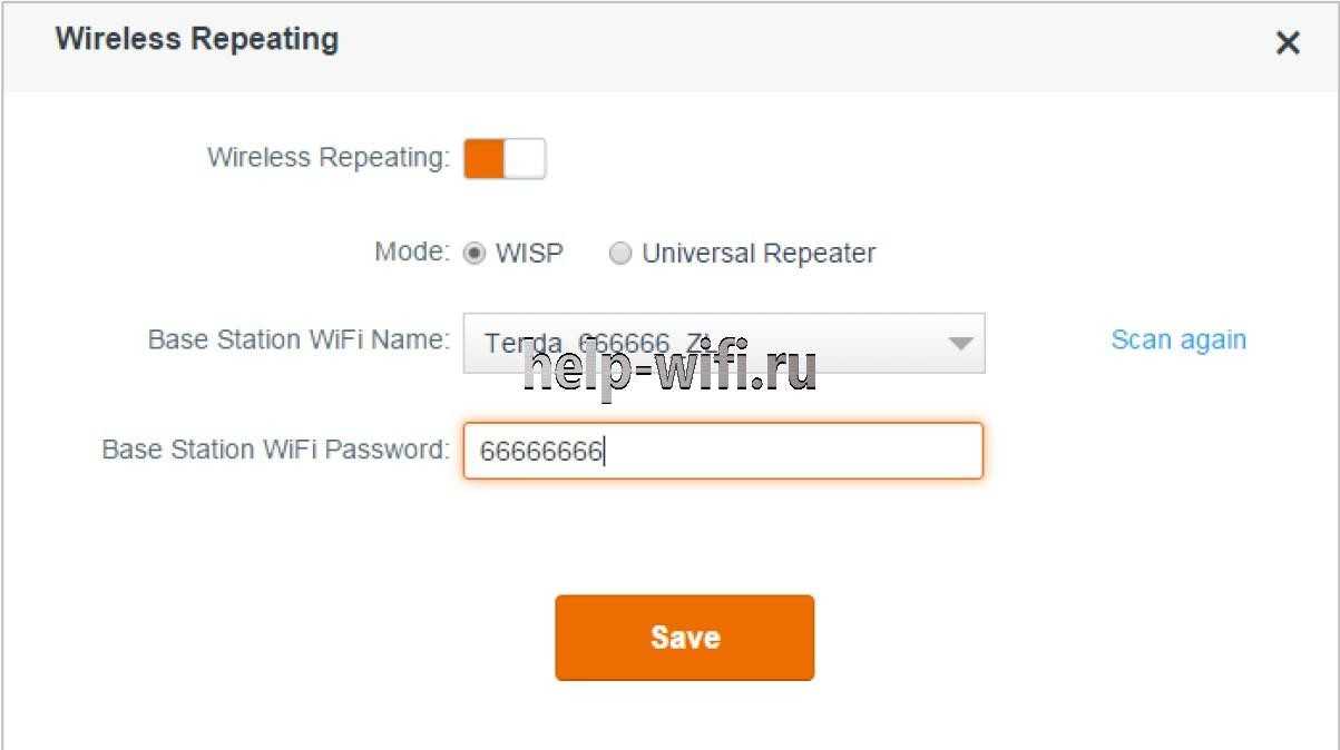 Войдите в пользовательский интерфейс маршрутизатора и нажмите «Настройки Wi-Fi» -> «Wi-Fi ретрансляция». Нажмите кнопку «Wireless Repeating», чтобы включить эту функцию.