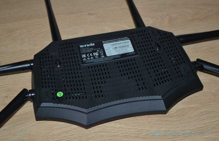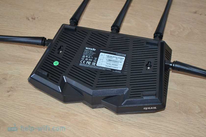 Снизу есть два отверстия с помощью которых можно закрепить роутер на стене. Так же снизу и по бокам есть много отверстий для охлаждения производительной начинки роутера. Ну и наклейка с заводской информацией, которая может пригодиться при настройке Tenda AC11.