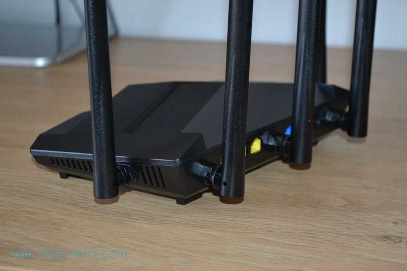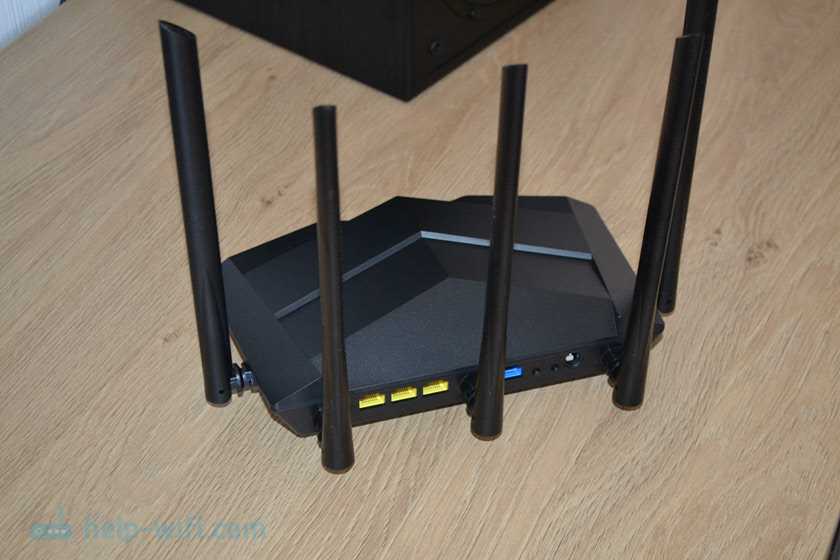 По бокам и сзади расположены 6 мощных антенн с усилением 6dBi, которые отвечают за широкий радиус покрытия Wi-Fi сети в диапазоне 2.4 ГГц и 5 ГГц. Антенны несъемные, но они поворачиваются в двух плоскостях.