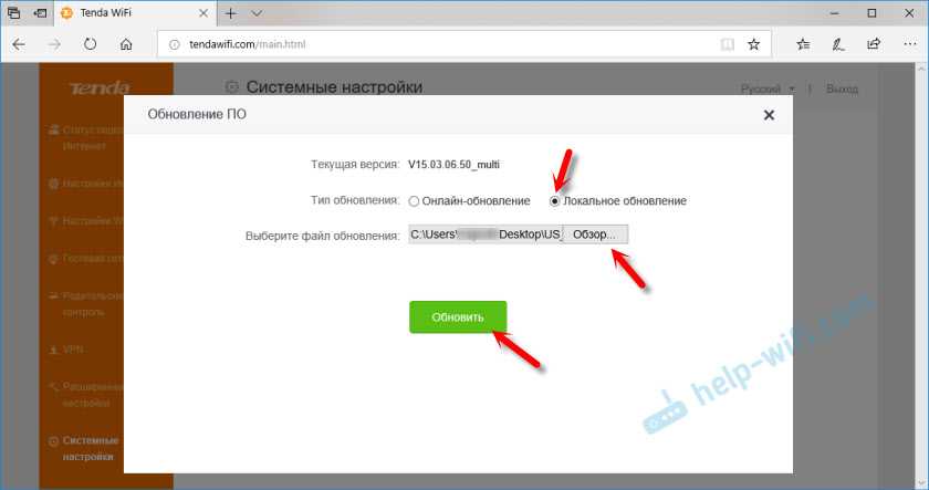 Выполнить обновление прошивки маршрутизатора Tenda AC6 можно в разделе «Системные настройки» – «Обновление ПО». Там же будет указана текущая версия прошивки.