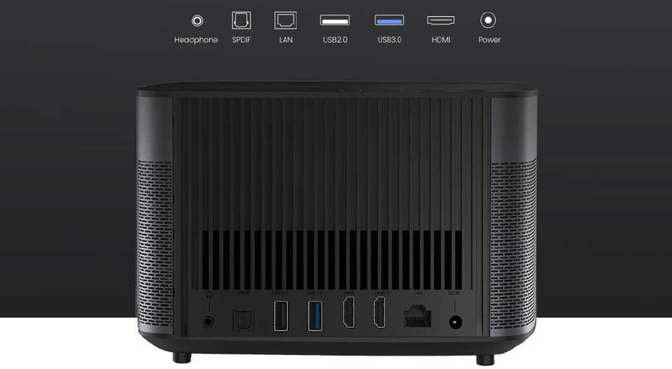 Здесь лаконично сочетаются строгие линии, минимум управляющих компонентов, лаконичное расположение разъемов и кнопок. Никакого нагромождения устаревших и давно забытых VGA, DVI и AV, не говоря уже о пресловутых «тюльпанов», которыми до сих пор грешит добрая половина китайских производителей. Только HDMI и USB, а все основные элементы управления перенесены на пульт и в фирменное приложение для смартфона, которые соединяется с проектором по USB.